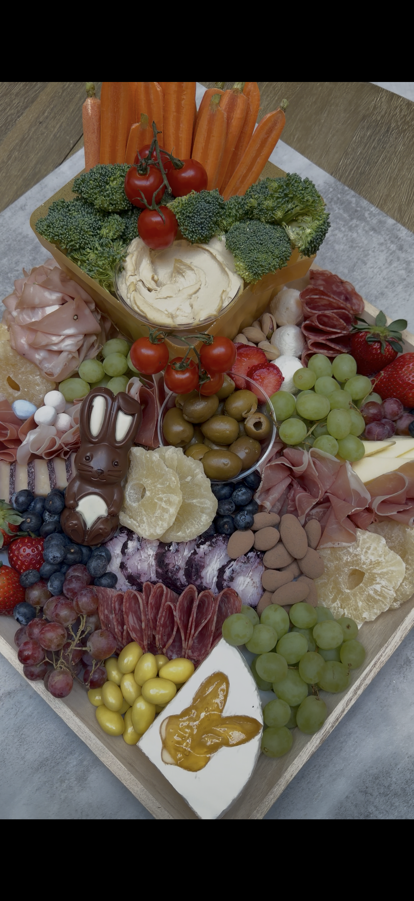 • Small basket with crudites & hummus• 5 cheeses: goat cheese, cheddar, Merlot cheese, blueberry goat cheese, brie• Apricot bunny centerpiece• Meats: mortadella, double prosciutto, salami• Chocolate-covered nuts• Limoncello nuts• Olives & pistachios• Dried pineapple• Chocolate bunny• Fresh fruit assortmentEaster Platter for 4-6 People